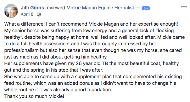 Mickie is qualified human nutritionist and health coach with a life long passion for natural health. After numerous issues with her rescue OTTB she decided to use some of her human nutritional knowledge, coupled with immune system boosting from a human herbalist to help him recover from years of abuse and neglect.