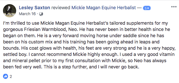 Mickie is currently studying a Diploma in Equine Naturopathy as well as completing a qualification in Master Hebalism.